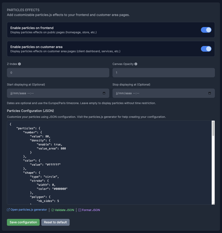 Bring your interfaces to life with dynamic, fully customizable particle effects, both on your frontend and in your customer area.